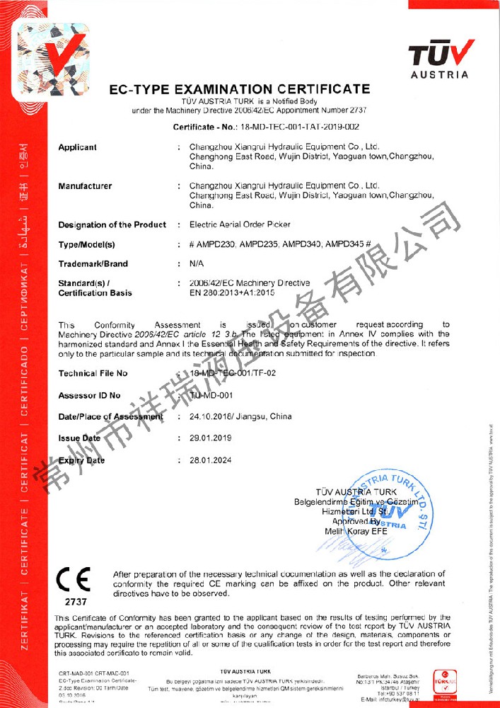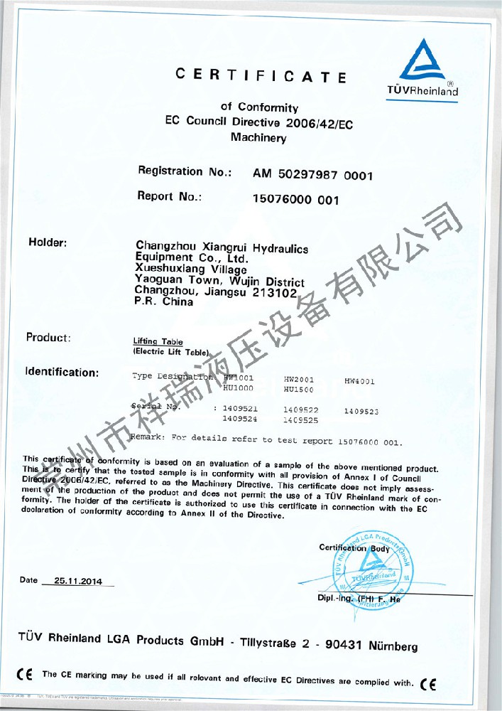 祥瑞液压 产品符合欧盟EN1570和ANSI/ASME安全标准